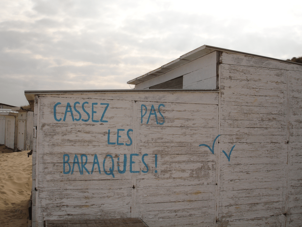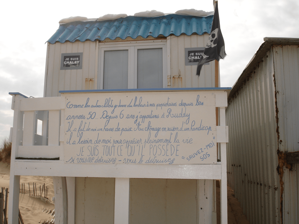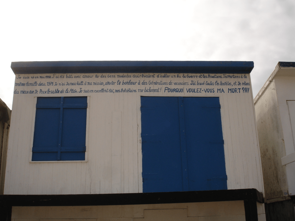 Dressés pour certains d’entre eux après que les guerres aient cessé, les voilà à présent soumis aux vents violents de la loi « littoral » qui fera, en octobre prochain, pareil au souffle du loup de James Halliwell, place nette de ces fragiles demeures nourries de sable, de sel et de joie d’enfants.